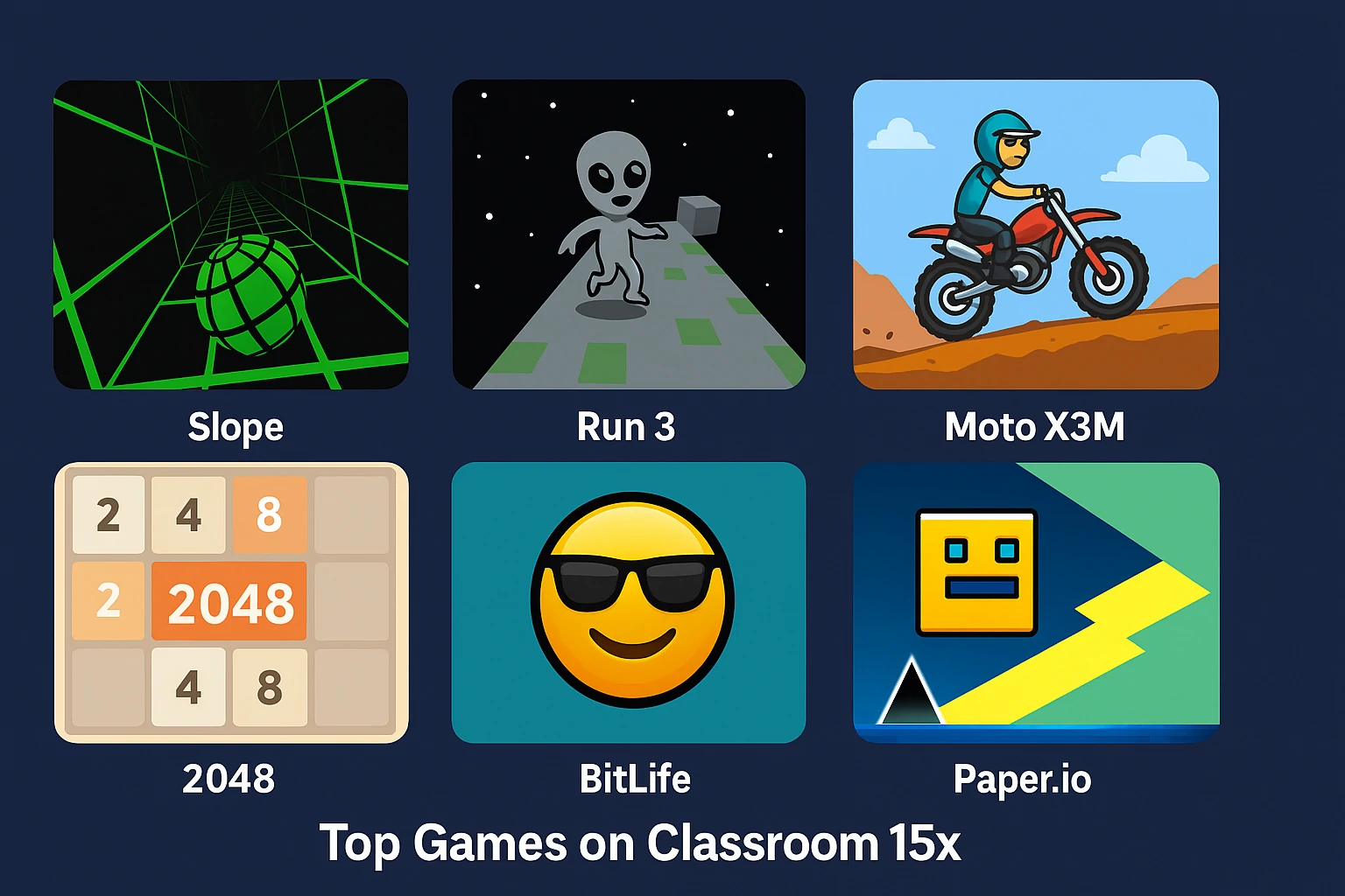 Popular unblocked games on Classroom 15x include Moto X3M, Geometry Dash, BitLife, 2048, and Paper.io. These games run fast and work well on low-power school devices.