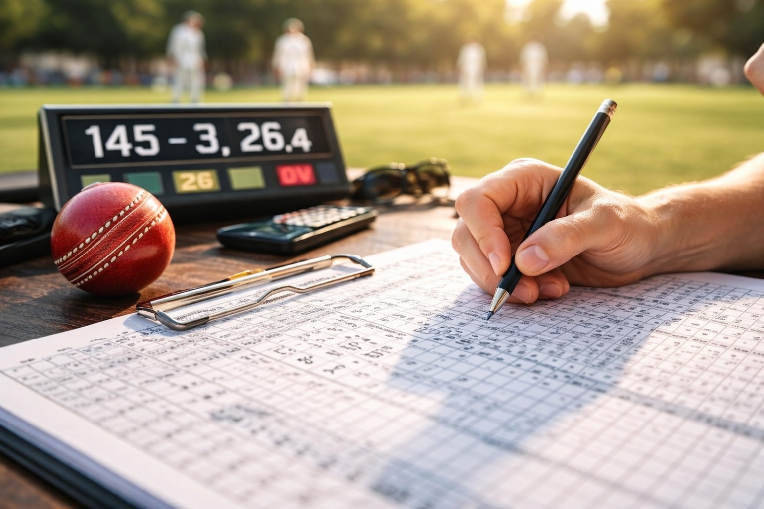 A scorer starts with team and player details before the match begins. Each ball then gets recorded in order. Runs, extras, and wickets appear exactly as they happen. Totals get checked at the end of each over and again at the end of the innings.